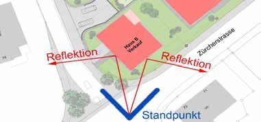 1. Man stellt sich an die Stelle, von der aus die Visualisierung gemacht wird, und überlegt, wie sind die Ausfallswinkel der Reflexionen an den Fenstern / Fassaden.