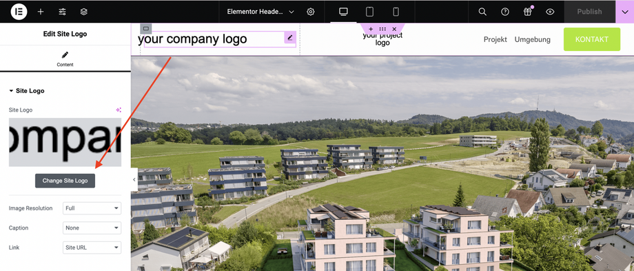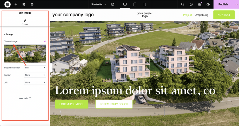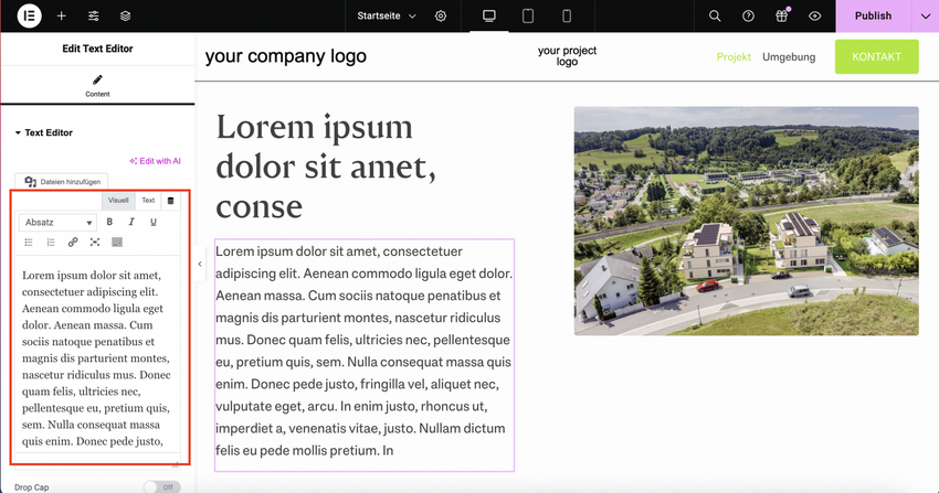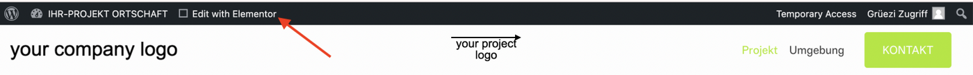 Unter "Ihr-Projekt Ortschaft" können Sie zwischen den drei Seiten "Projekt, Umgebung und Kontakt" springen und jeweils mit dem Elementor bearbeiten.